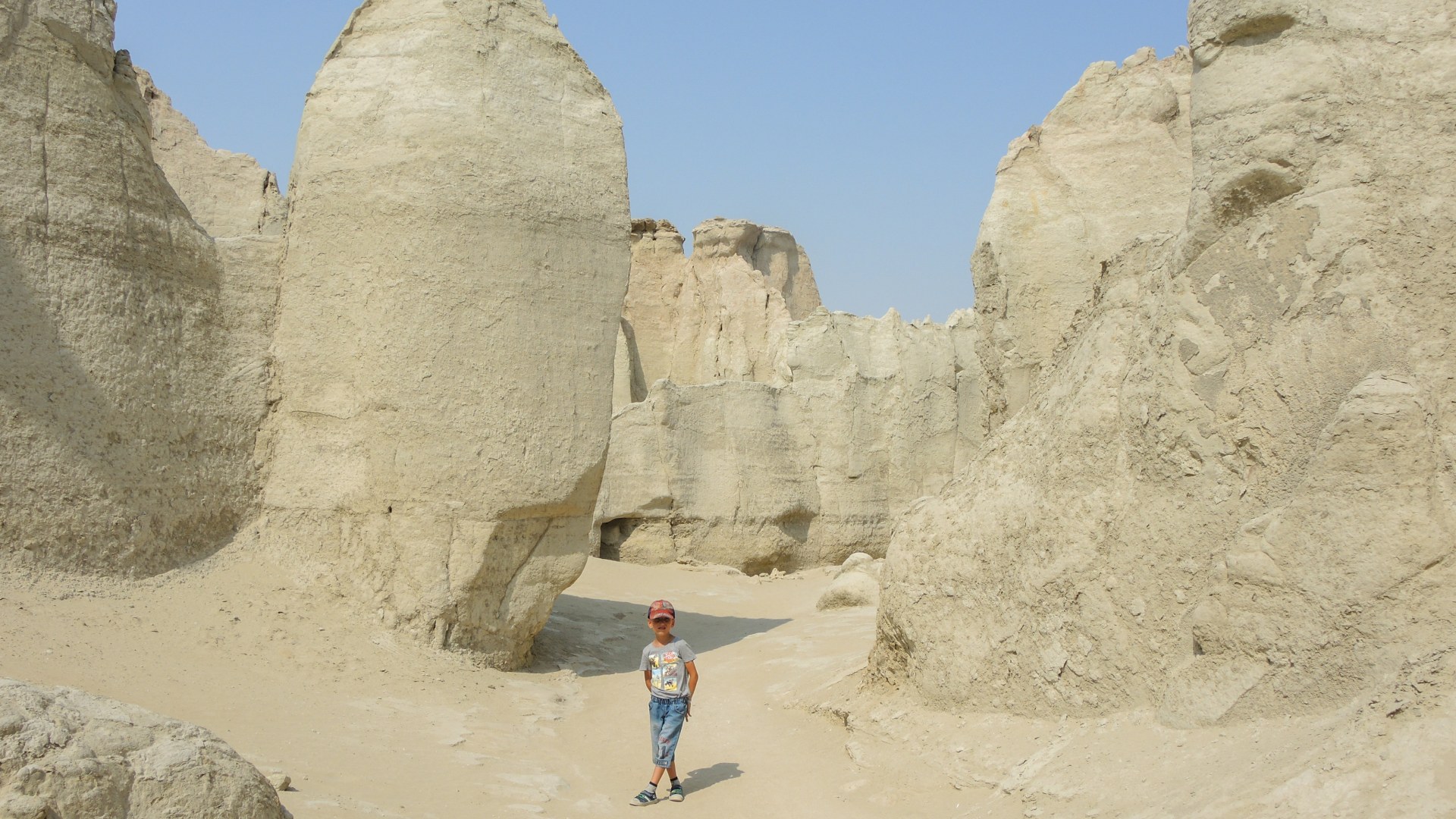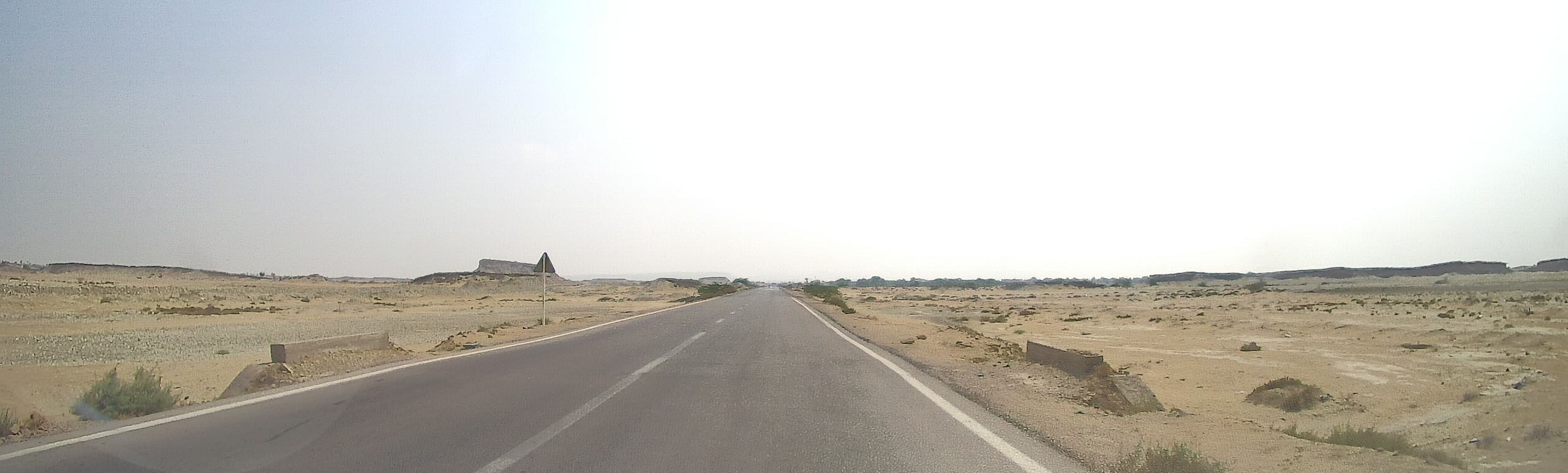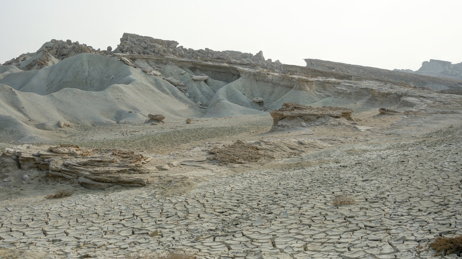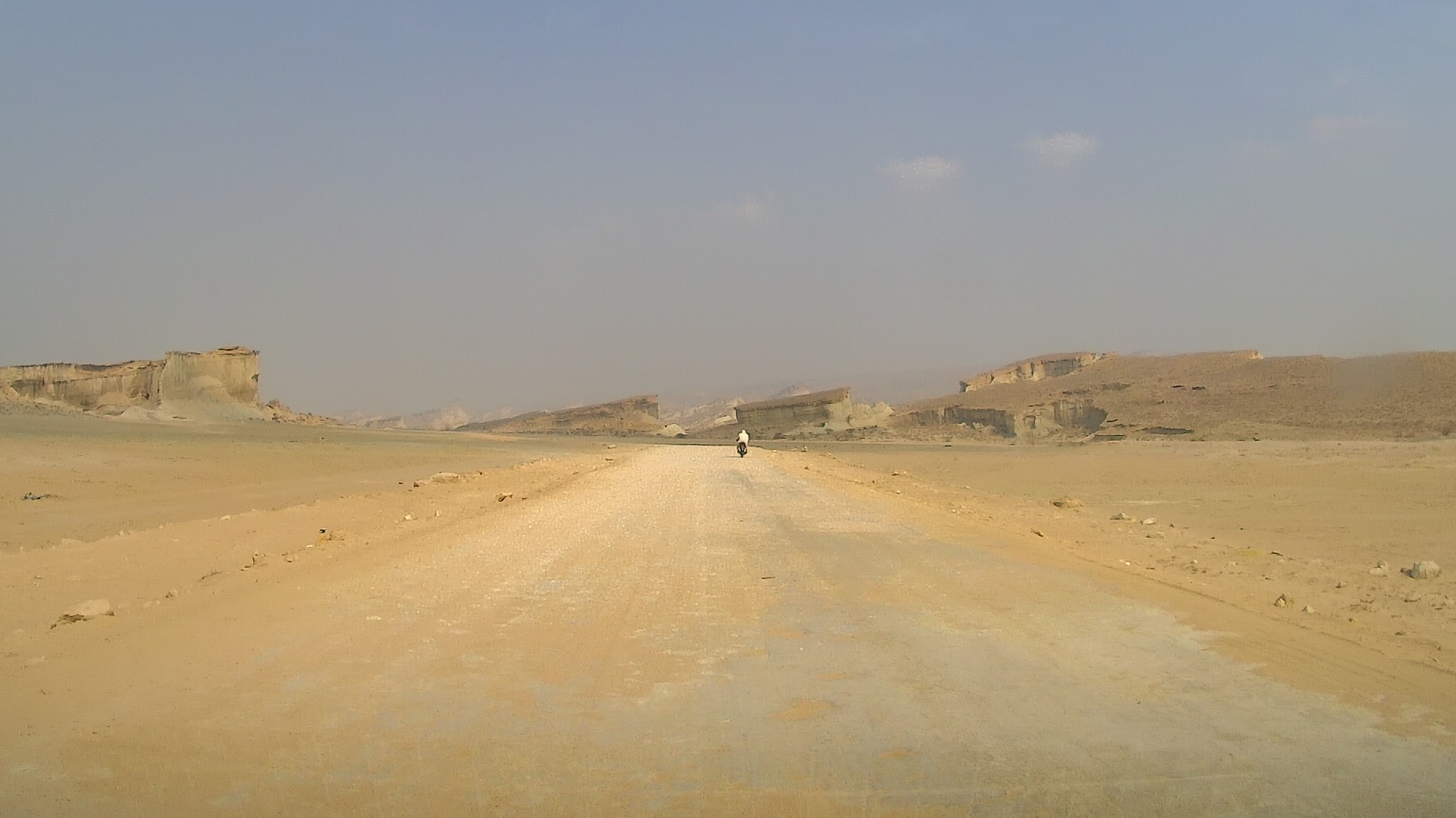 Дальнейший путь пролегал по пустыне. Жара, желтый песок, на горизонте очень красиво выветренные скалы. Растрескавшаяся от жары песочная земля.