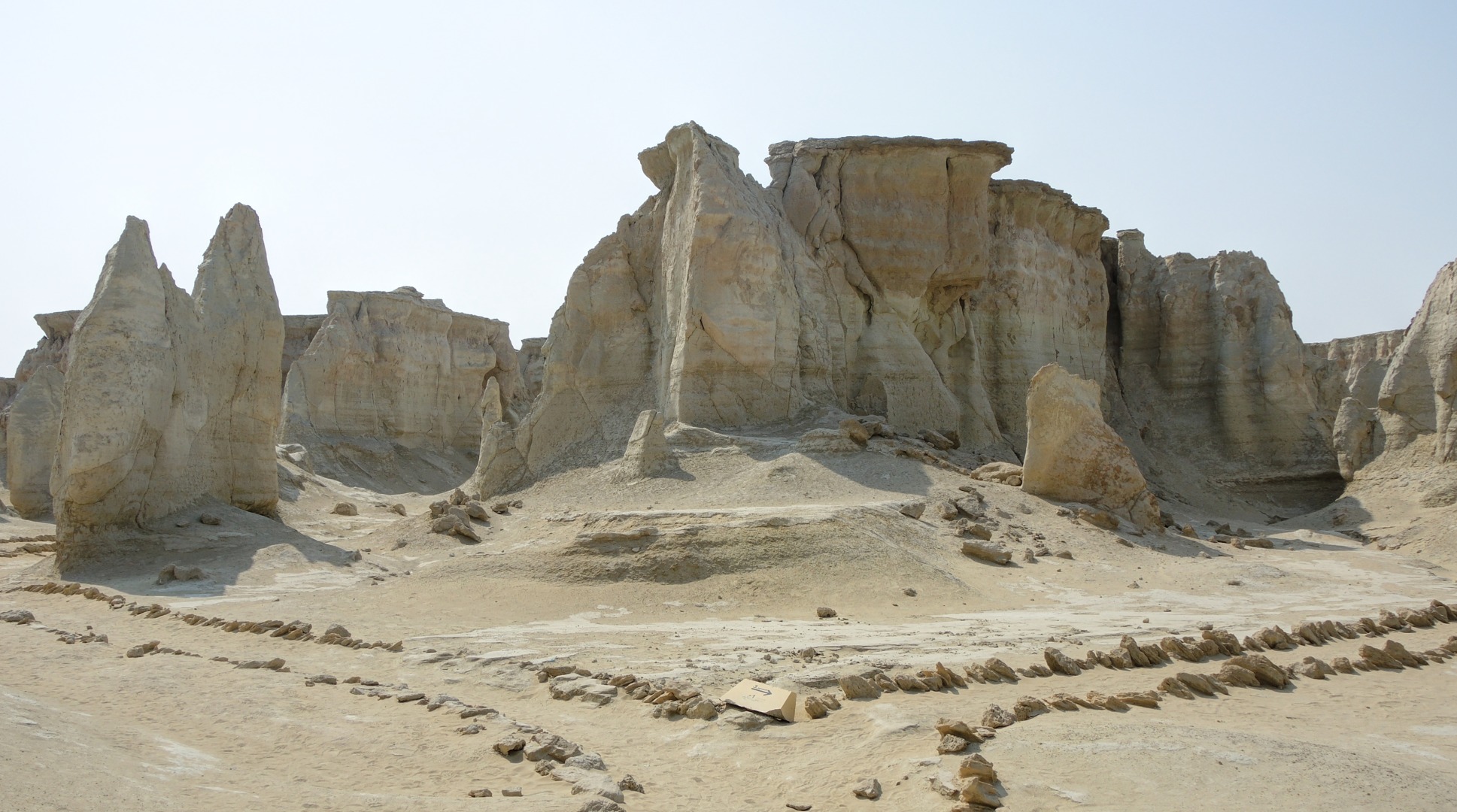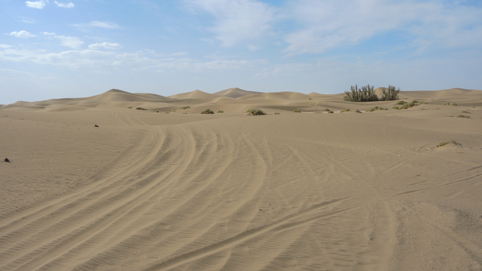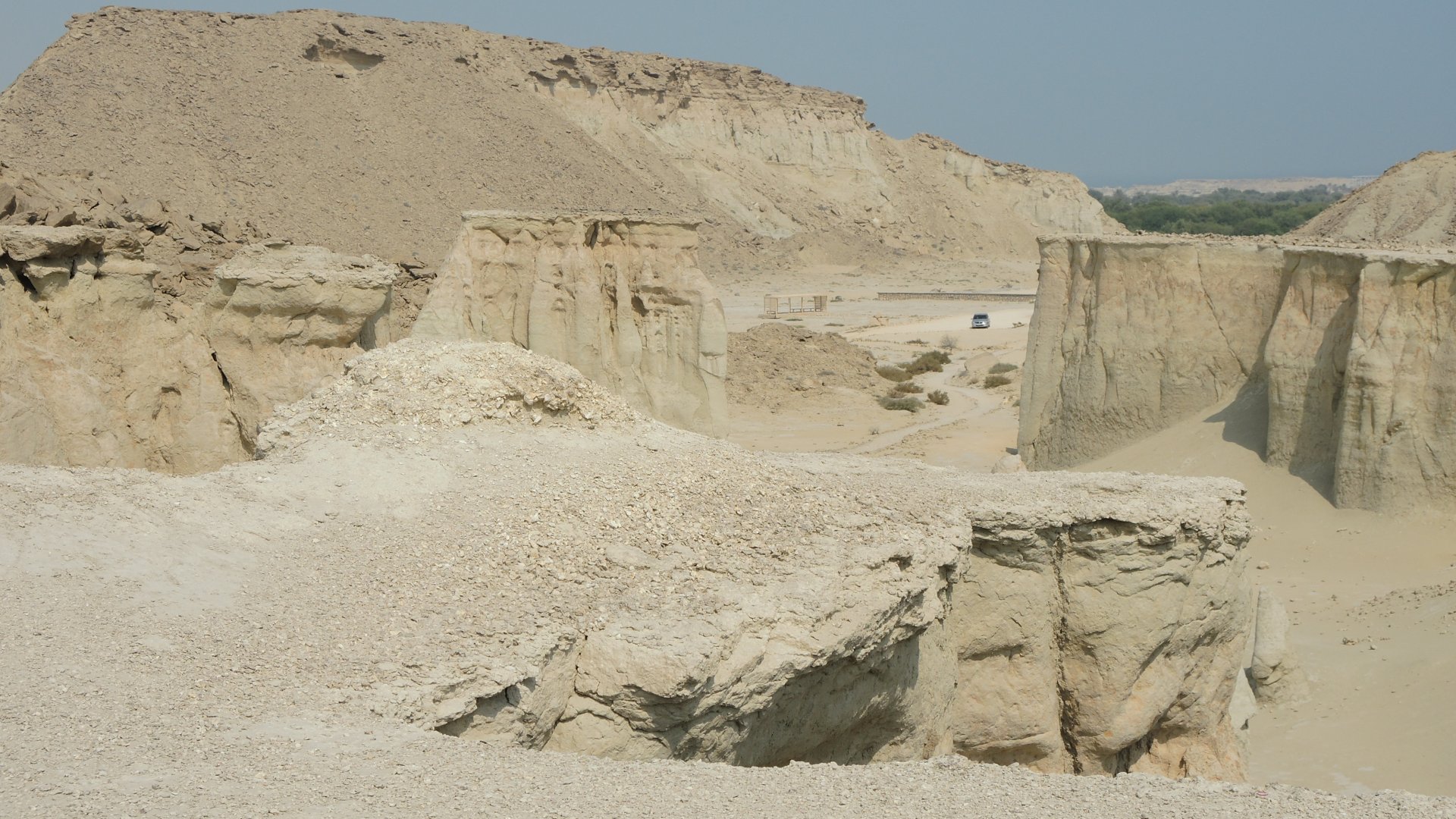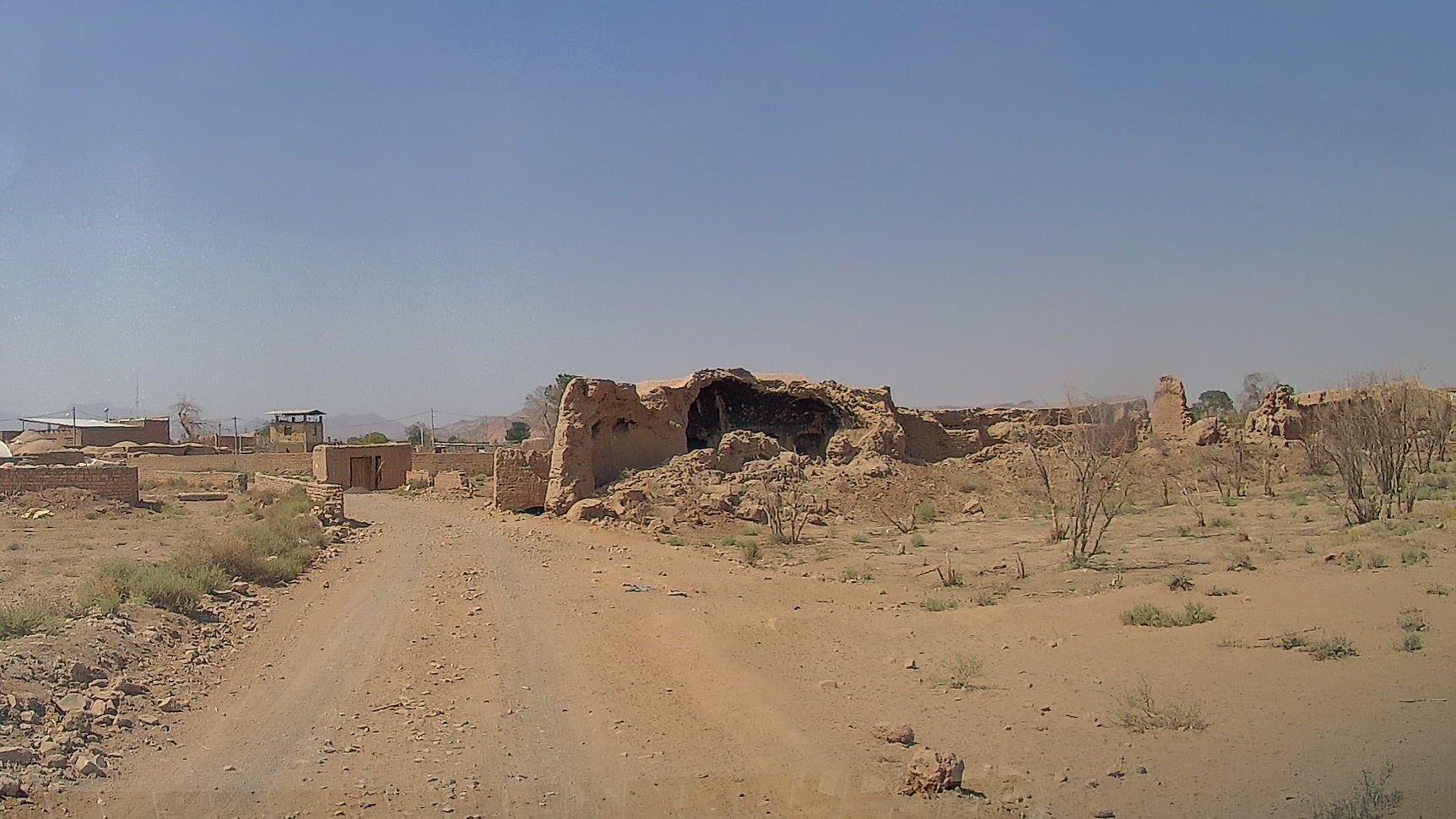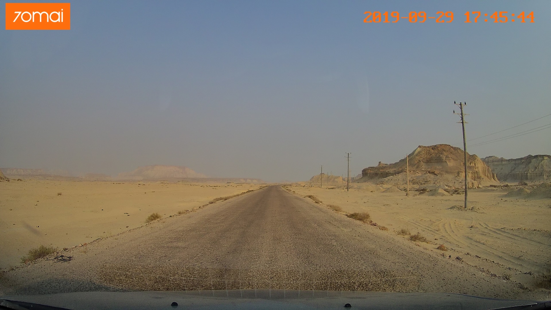 Дальнейший путь пролегал по пустыне. Жара, желтый песок, на горизонте очень красиво выветренные скалы. Растрескавшаяся от жары песочная земля.