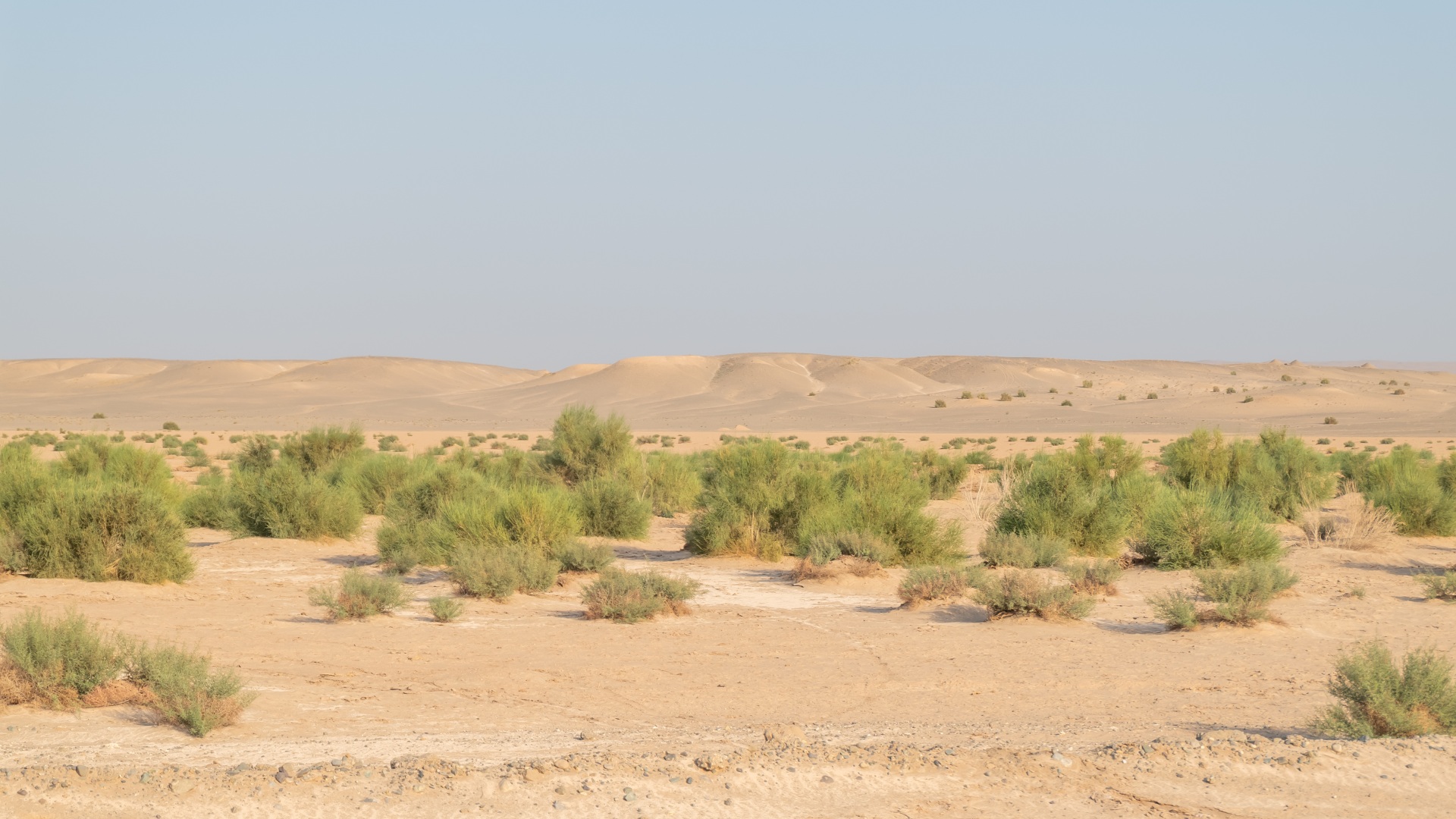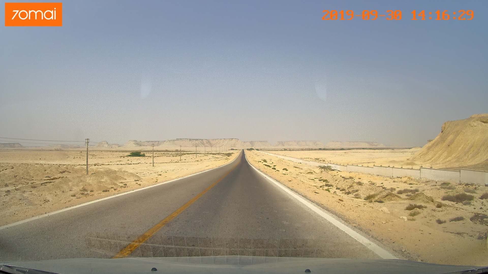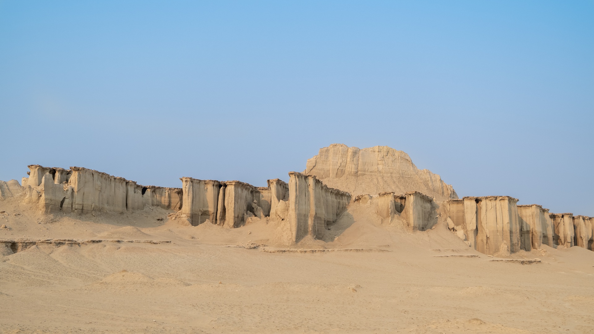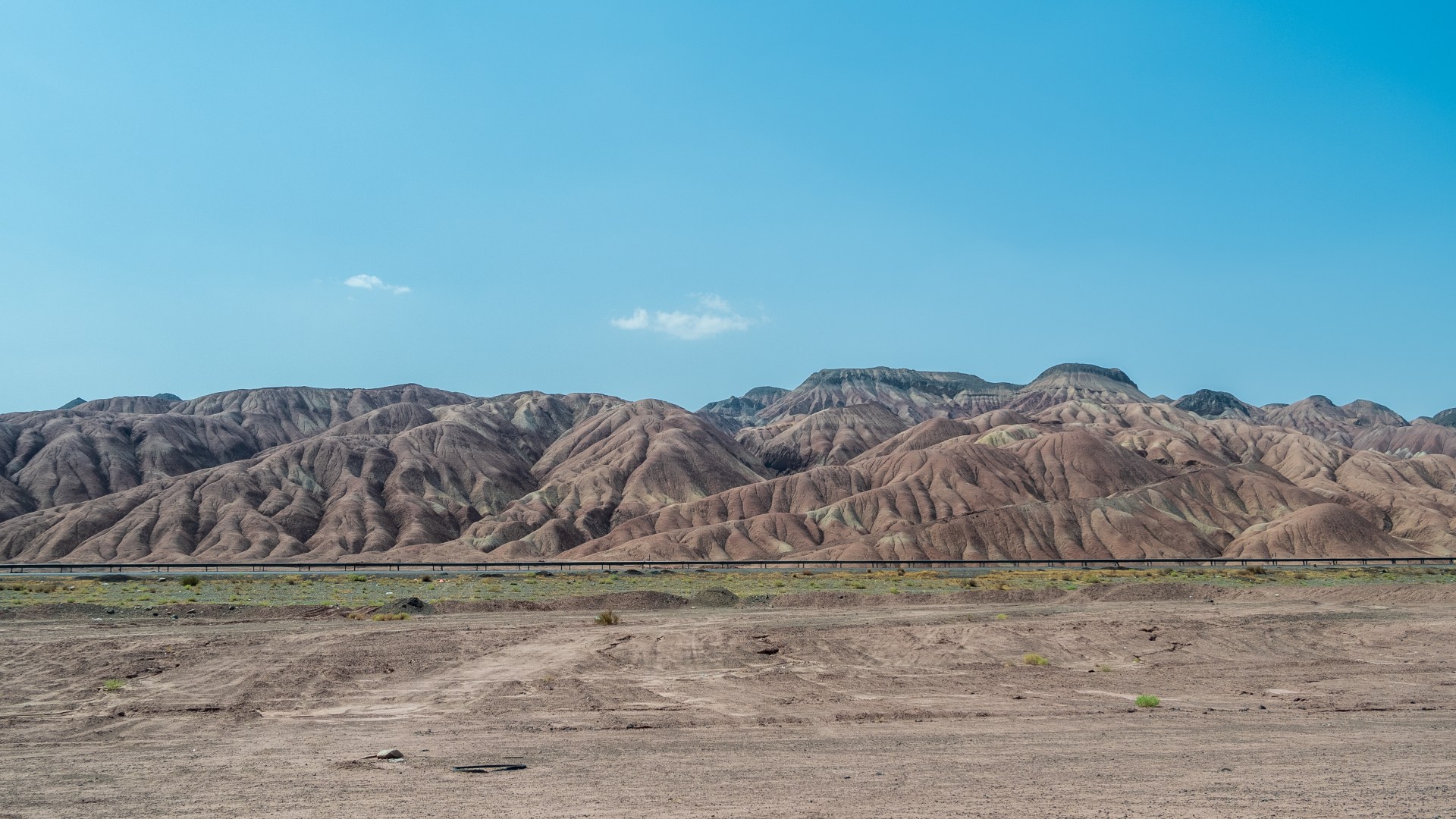 Дальнейший путь пролегал по пустыне. Жара, желтый песок, на горизонте очень красиво выветренные скалы. Растрескавшаяся от жары песочная земля.
