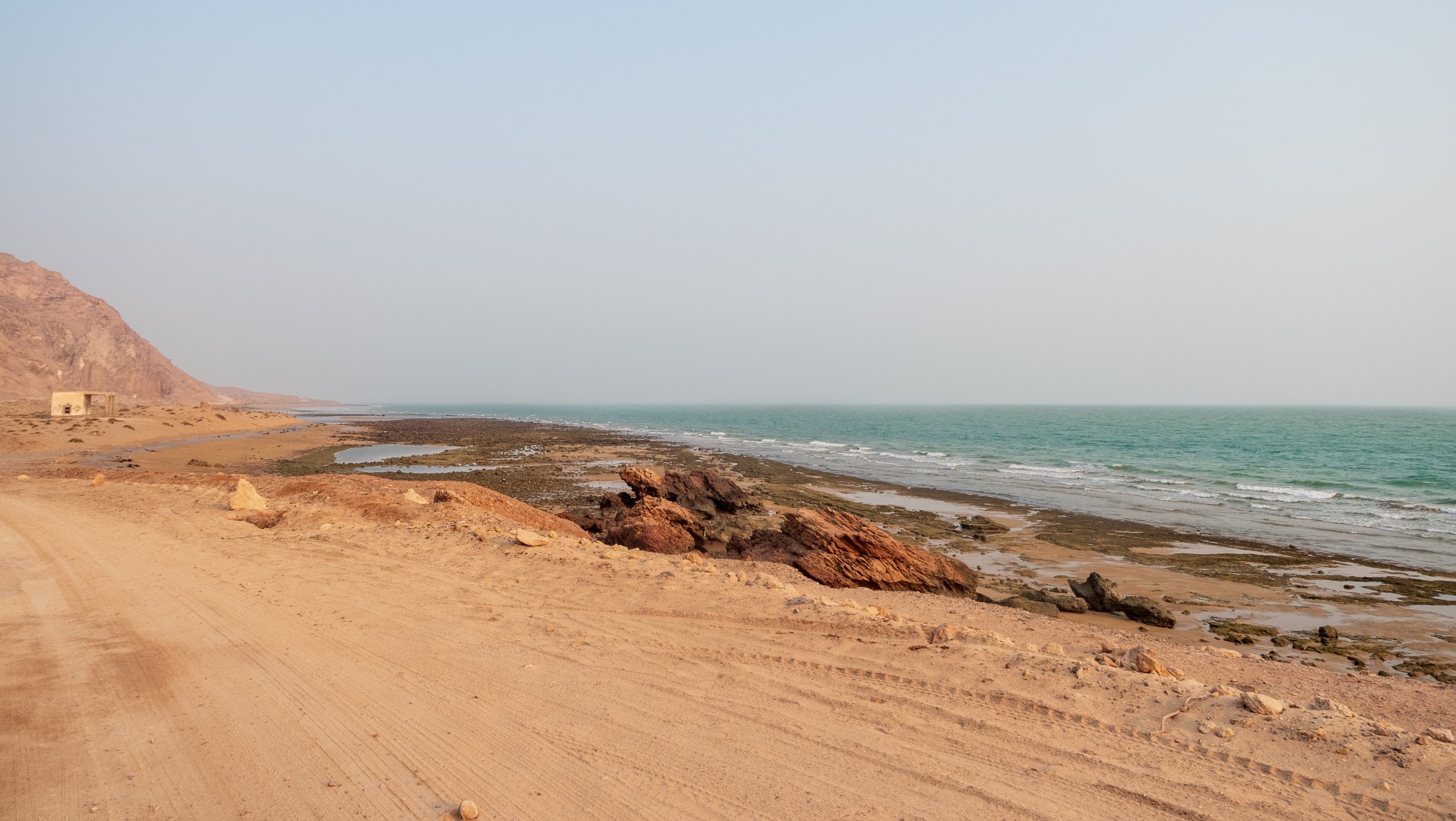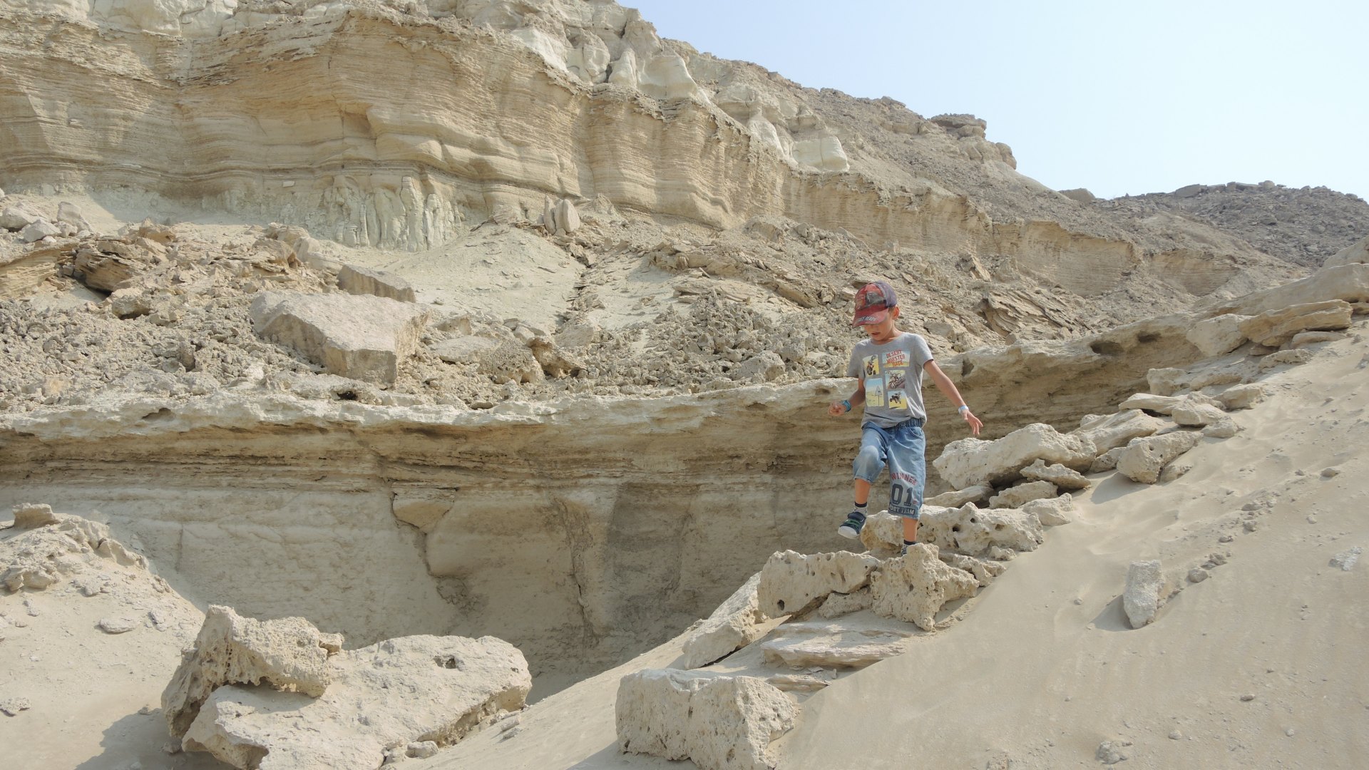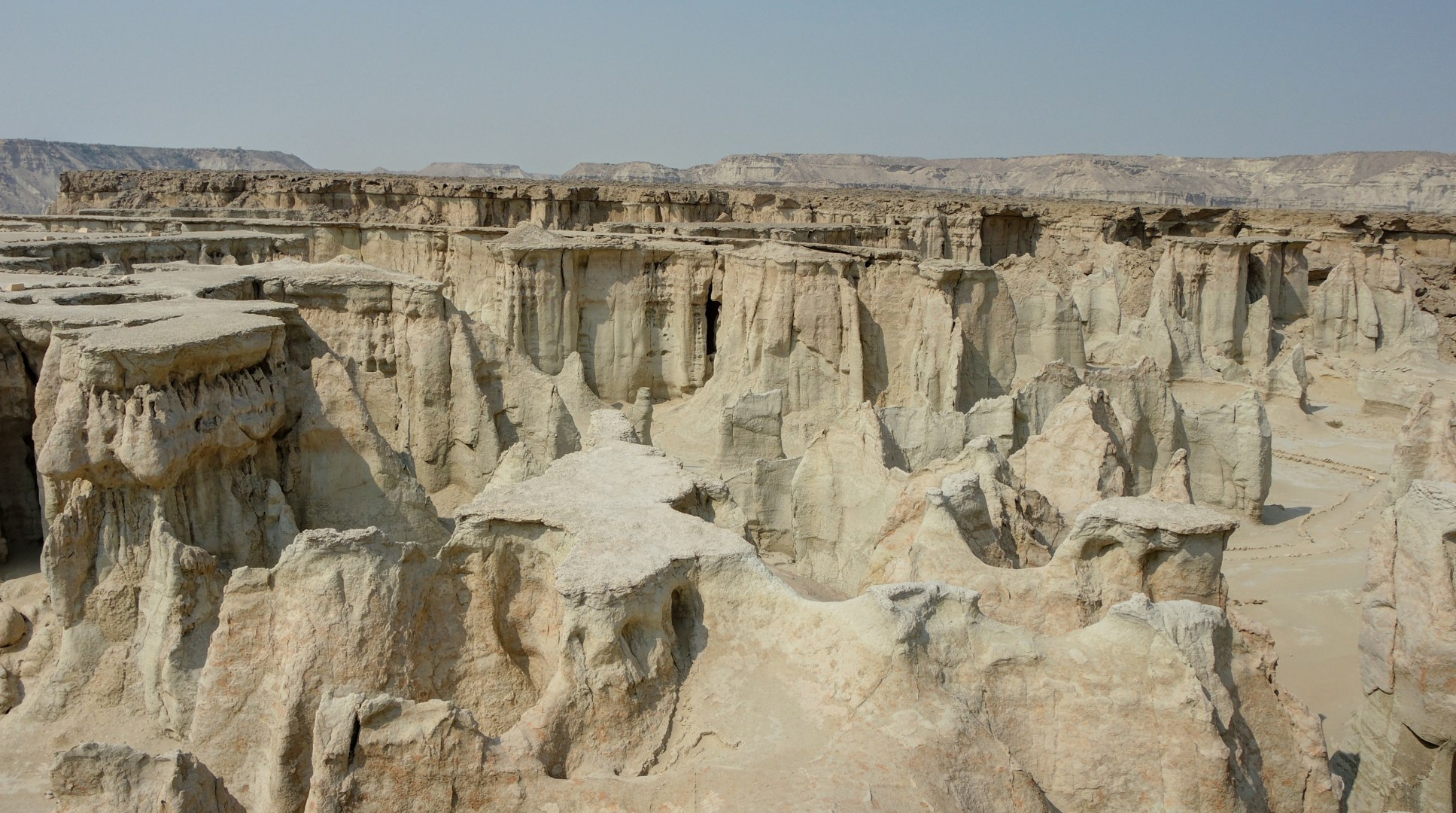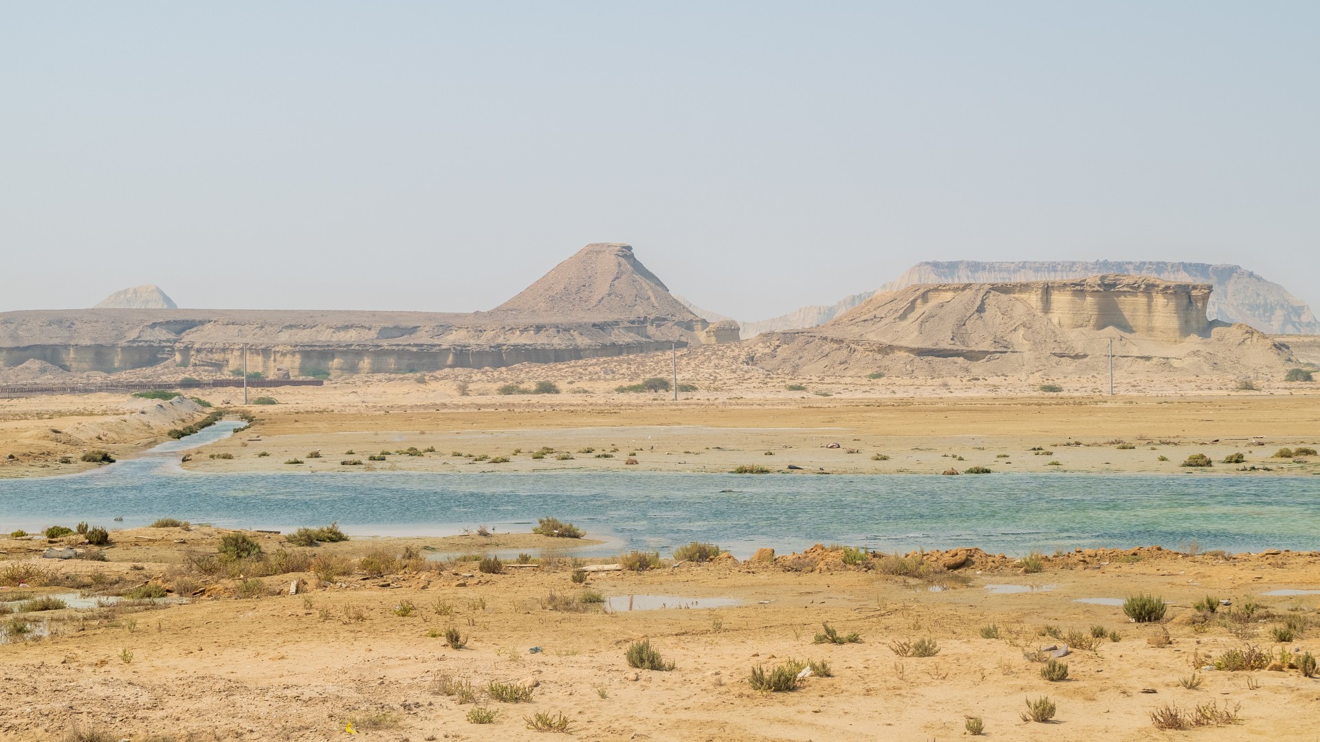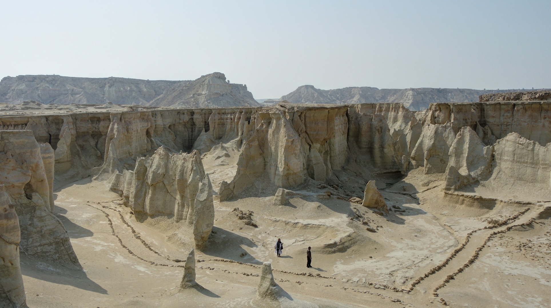 Дальнейший путь пролегал по пустыне. Жара, желтый песок, на горизонте очень красиво выветренные скалы. Растрескавшаяся от жары песочная земля.