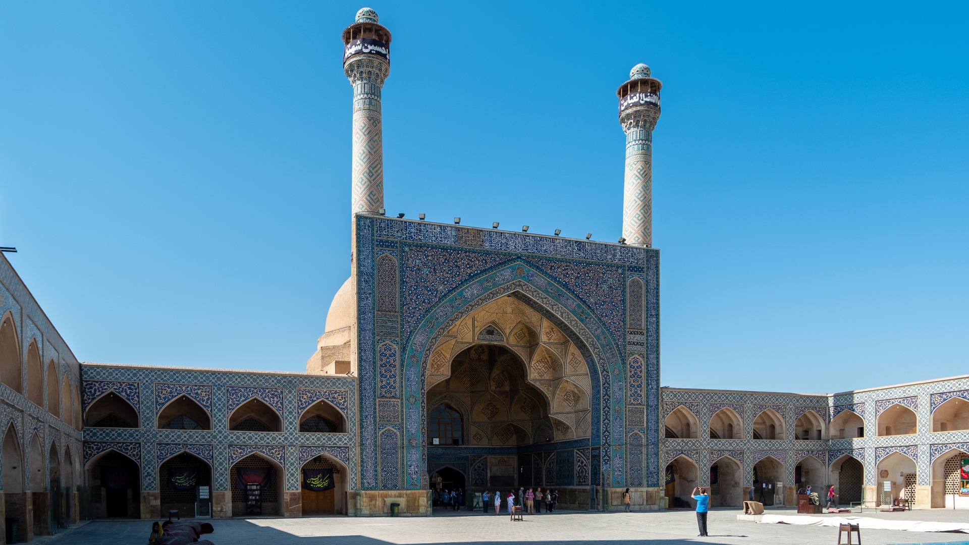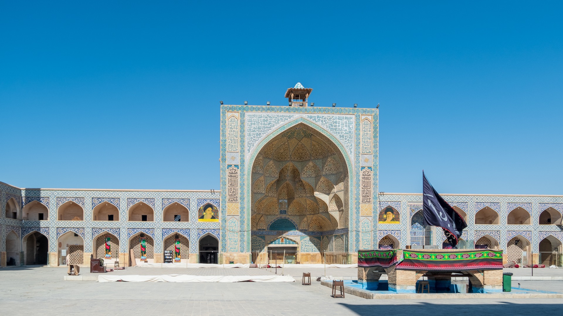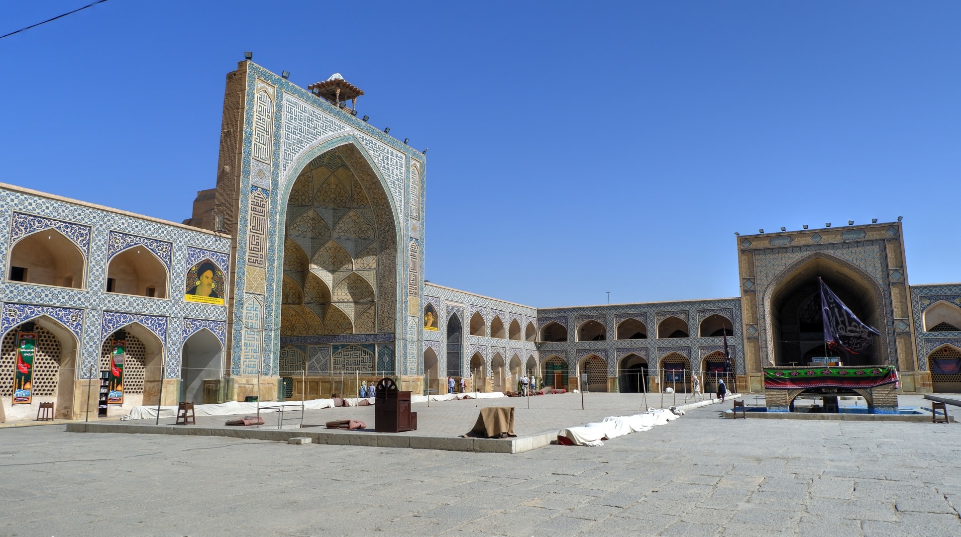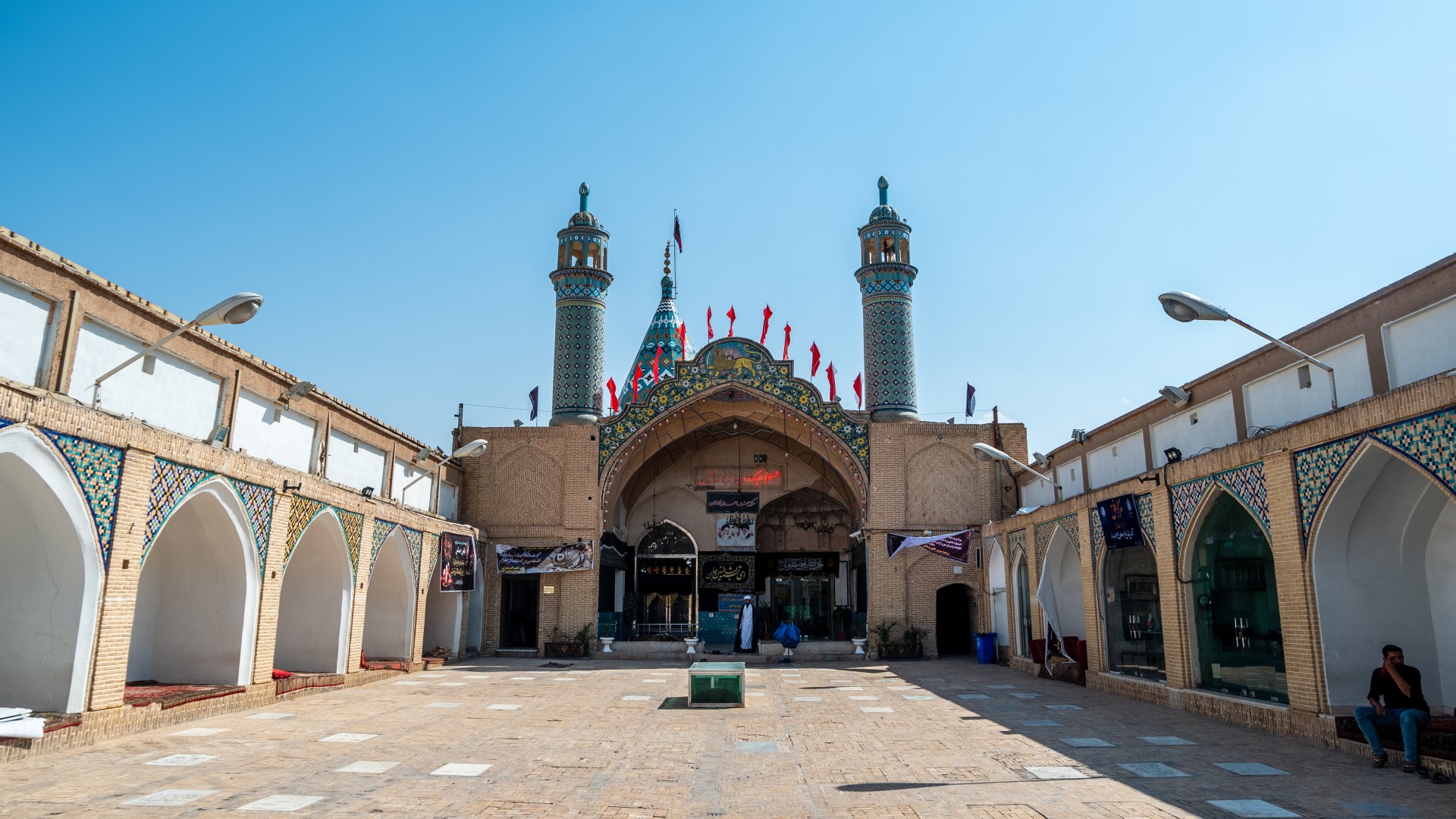 Джамкаран — это огромный комплекс, занимающий целый квартал, с небесно-голубыми куполами, светлым камнем и фонтаном в центре. Белоснежным камнем вымощена даже внутренняя площадь. А по периметру, в тени, сложены рулонами огромные ковры — для желающих поспать, прилечь или помолиться.