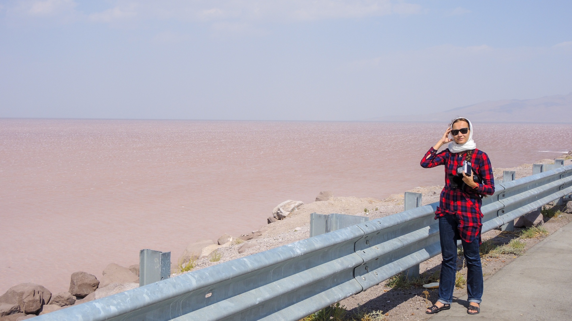 В разное время года оно то полноводное, то полностью пересыхает. А с одной стороны мы даже нашли пляж. Правда, сейчас вода высохла и отошла от пляжа очень далеко. Хотя я все равно не представляю, как люди отдыхают на таком ветру. А он тут такой силы, что через мост который проходит через все озеро переносятся тучи соляной пыли и если не держаться за машину или не прятаться за укрытиями, то порывами может сдвинуть на метр. И все это на высоте больше 1000 метров над уровнем моря. Дети отказались выходить из машины, а мы, взрослые, с удовольствием полюбовались солёными корками на соленом ветру.