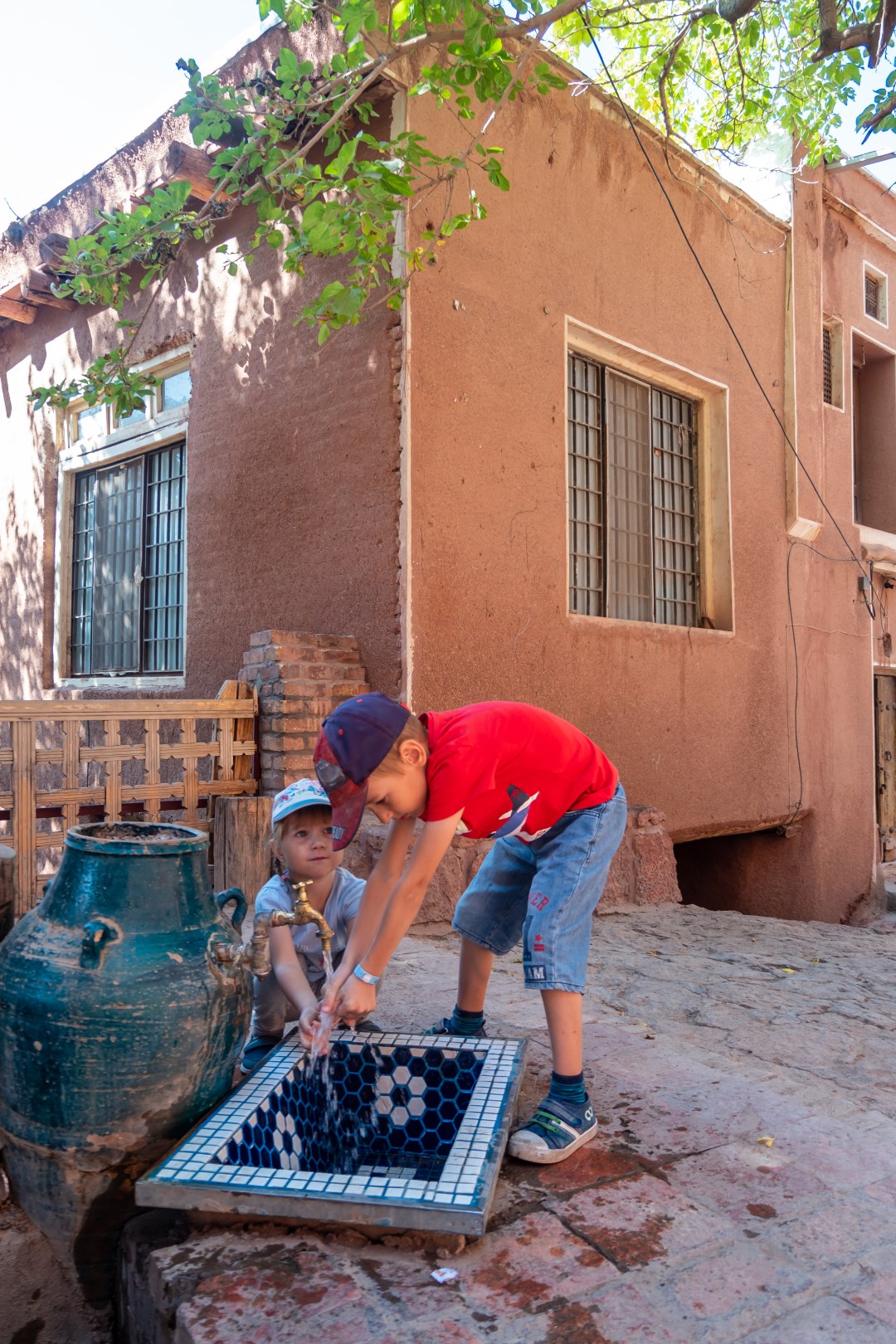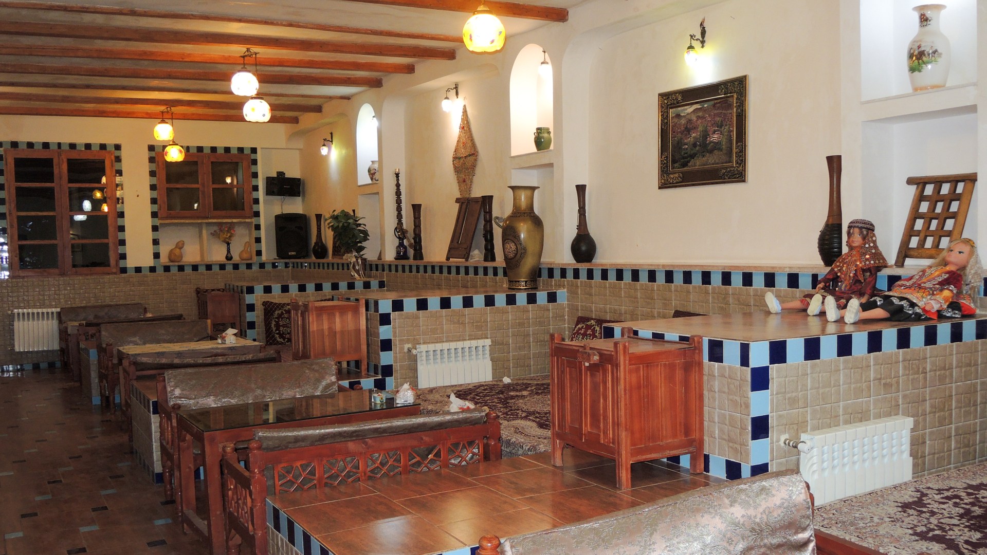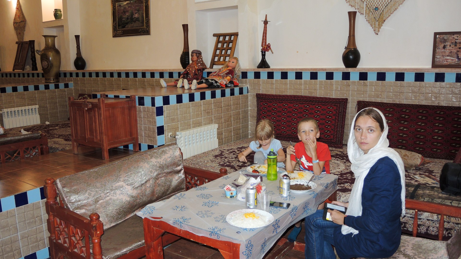 Ibesina Traditional Hotel / Atigh Traditional Hotel — самая тихая и симпатичная гостиница, что мы посетили в Иране. Уютный обновленный караван-сарай, с фонтанчиками и столиками для завтрака вокруг них, отзывчивый персонал с отличным английским, а главное, искренне доброжелательные сотрудники. В этой части страны многие относятся к иностранцам, как к овцам — лишь бы «остричь». А в этом отеле хозяин даже подарил детям картину на стену с национальными мотивами и наказал следить за дочкой, потому что «такую девочку тут все хотят».
