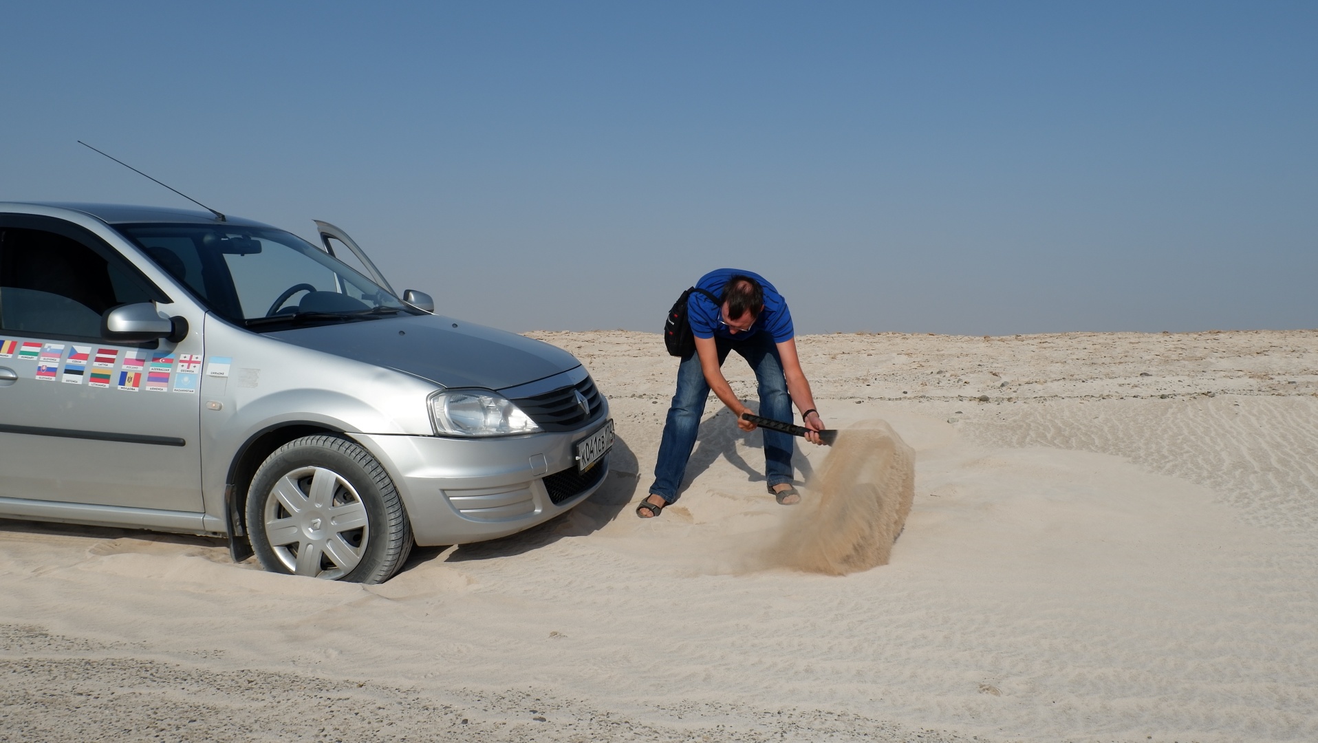 А дальше была пустыня Мираджаб. Собственно, ехать в нее лучше из деревни НушАбад, там встречаются коричневые указатели на пустыню, там же можно нанять такси. Но мы этого не знали, а наш навигатор лёгких путей не ищет, поэтому залезли на Логане Бог знает откуда, напролом через каменистые барханы, а в одном месте даже зарылись и пришлось немного помахать лопатой.