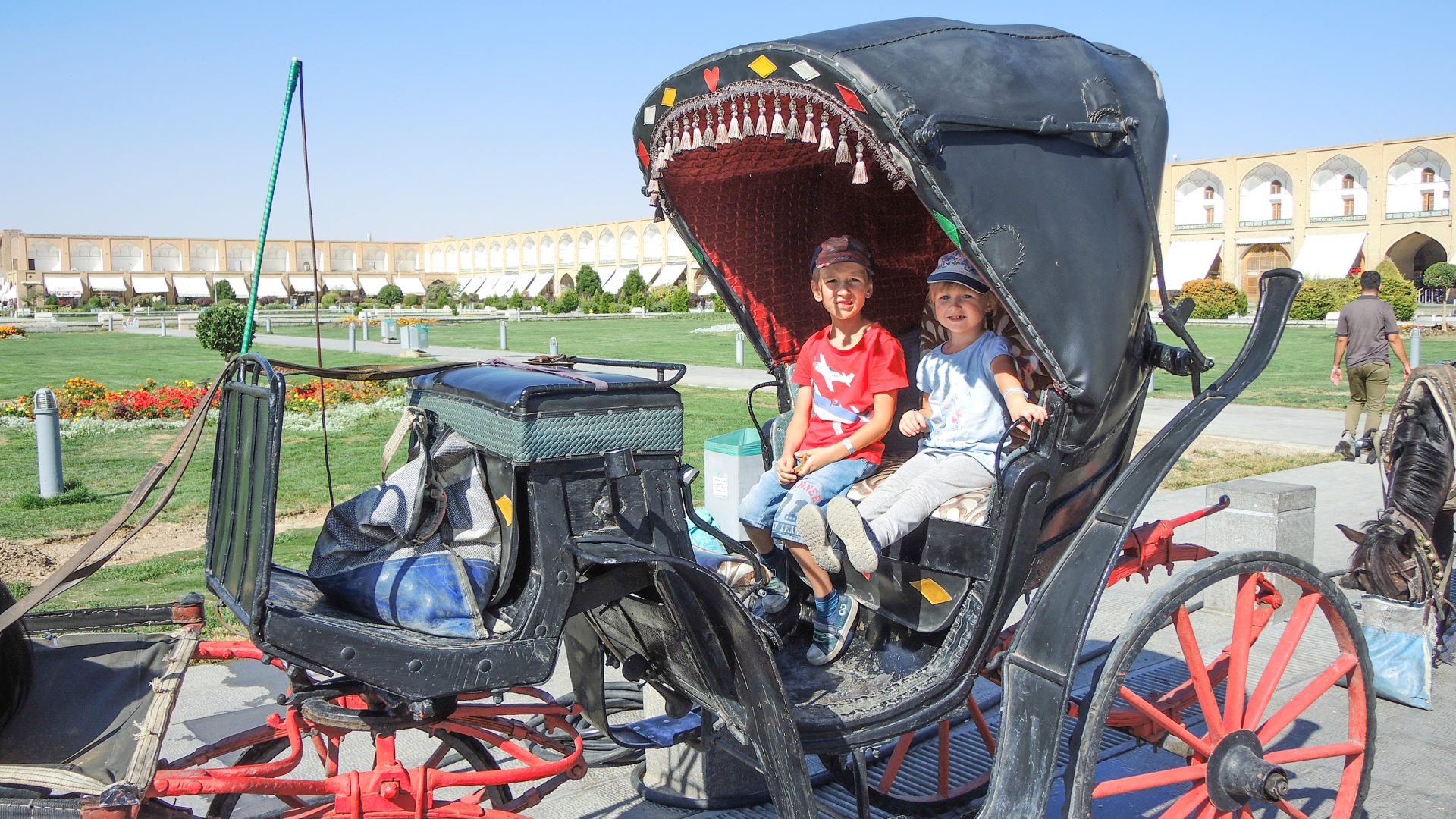 — все оформлено в единый архитектурный ансамбль. По центру огромный фонтан, и всего за 1$ можно прокатиться на конной повозке по периметру. Из своеобразной повозки почти ничего не видно, зато детям весело.