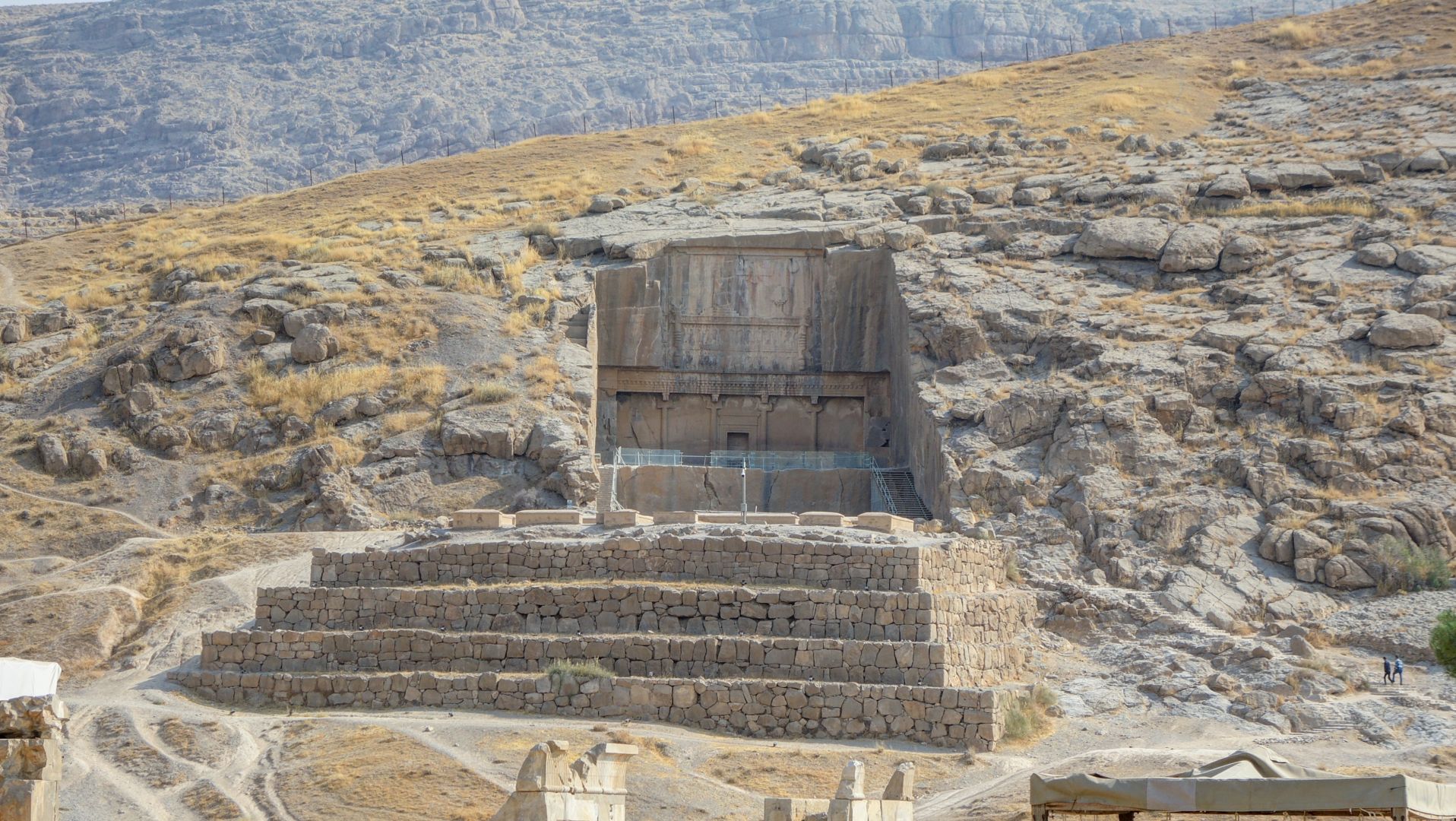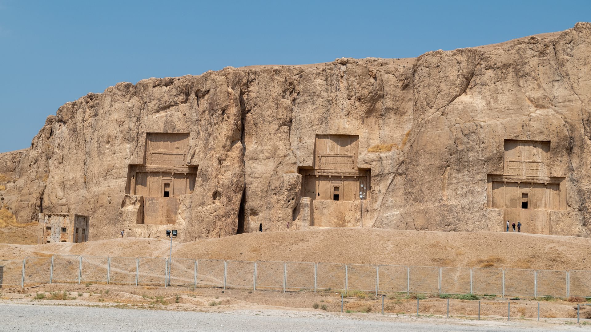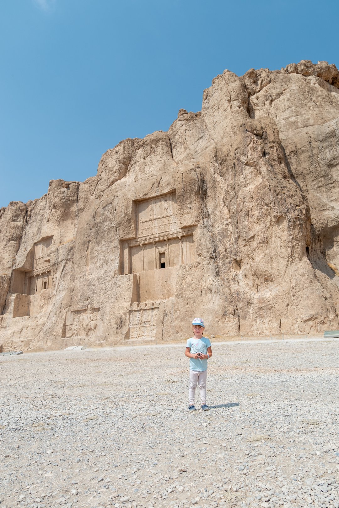 Буквально в трёх километрах находятся гробницы царей, в том числе и Дария Второго. Огромные гробницы высечены в скалах, у них большие крестообразные входы, с выбитыми в породе рисунками и надписями.