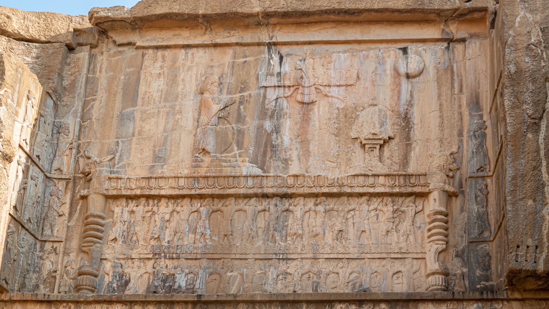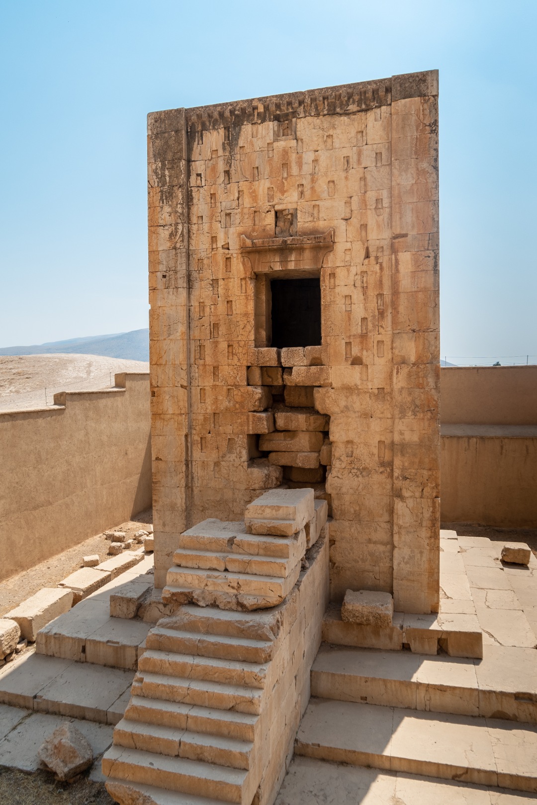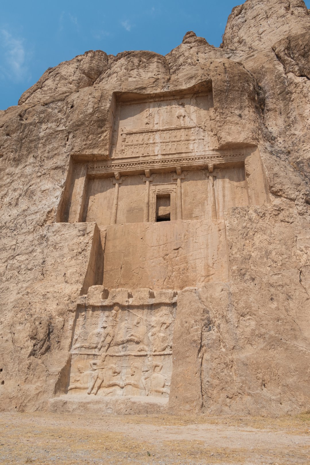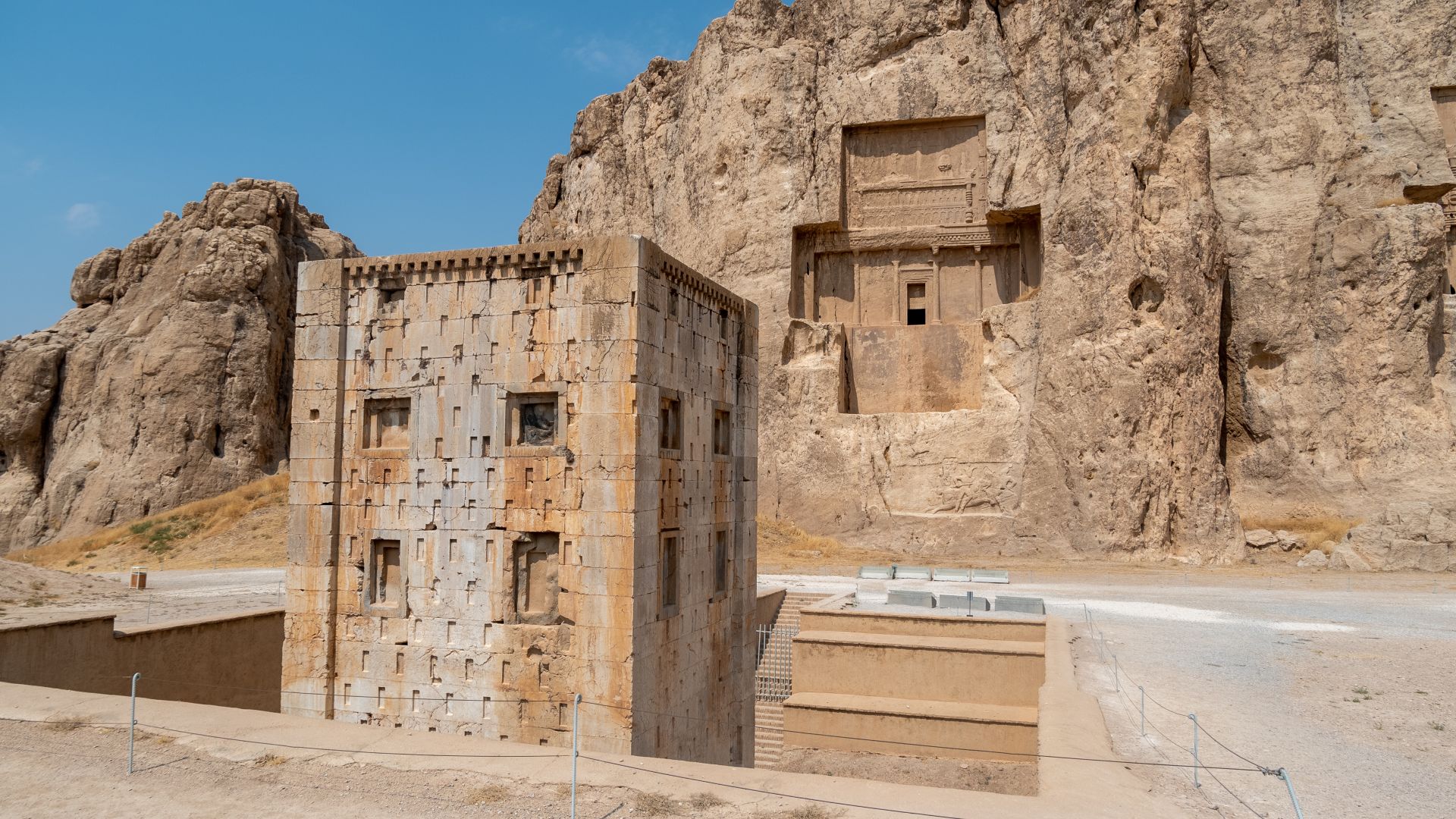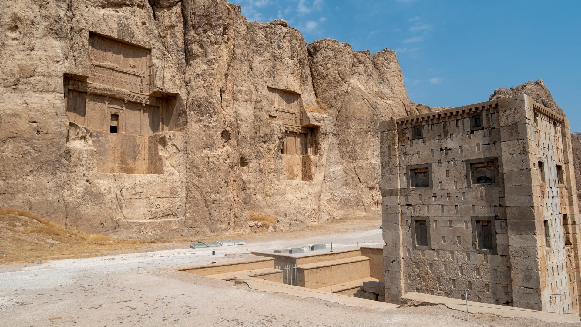 А напротив них — куб Заратустры. Предполагают, что это тоже чья-то гробница, и она датируется более ранней эпохой, чем возникло учение зороастризма. Но все они расположены в один ряд на одной скале, так что здесь особо гулять негде.