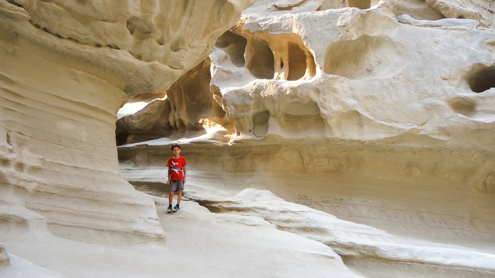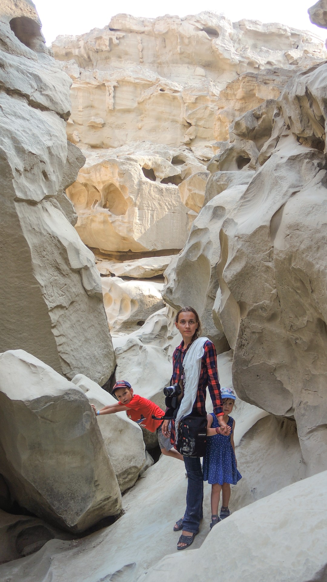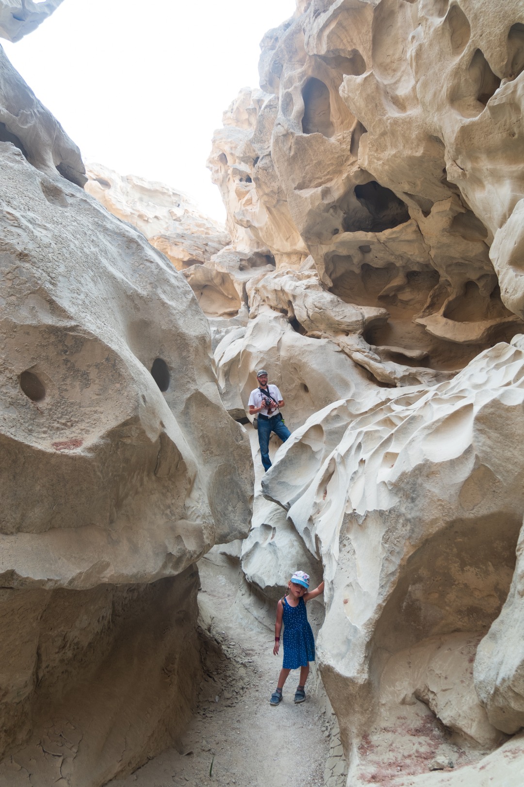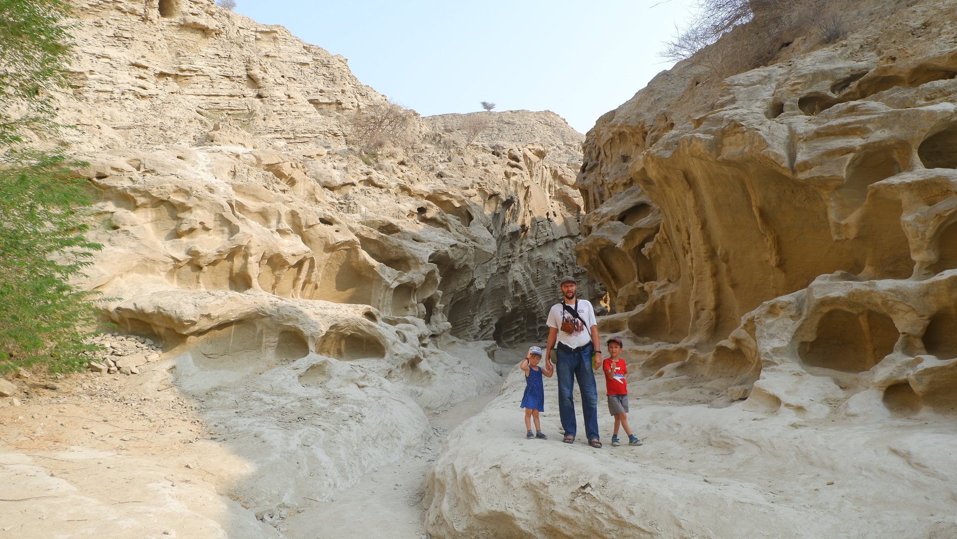 И смотреть, чтобы не упасть в колодец или расщелину. Напоминает одновременно и Чарынский каньон в Казахстане, и виды с рекламных плакатов про Иорданию. Но жара здесь просто чудовищная. Мы перед выходом из машины облились с ног до головы водой — футболки, кепки, джинсы… На ветру и на солнце высохло все моментально.