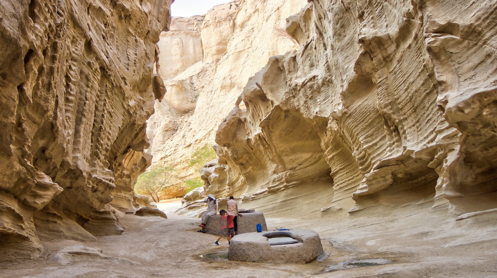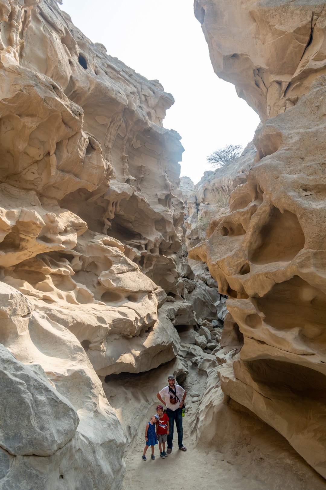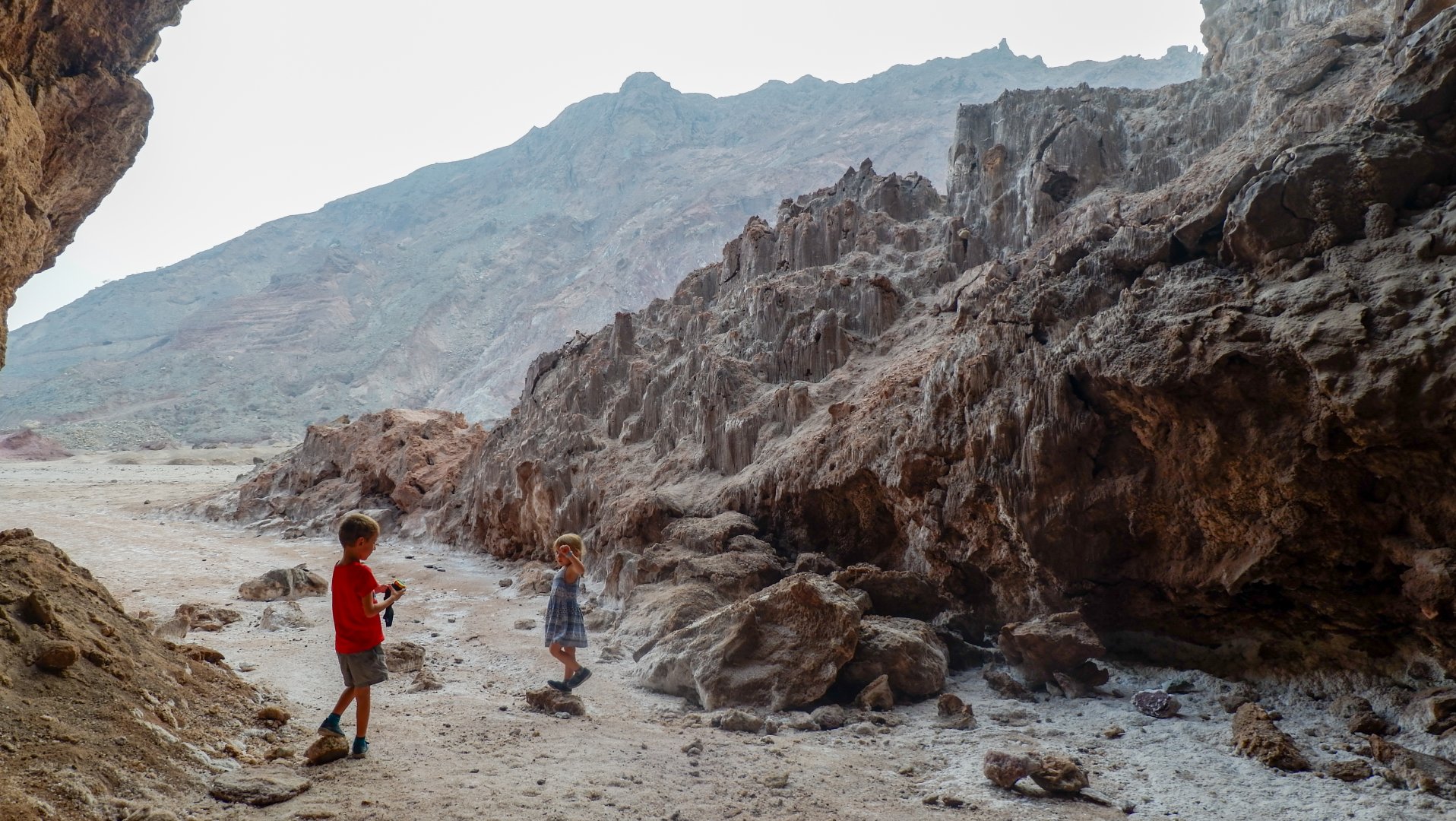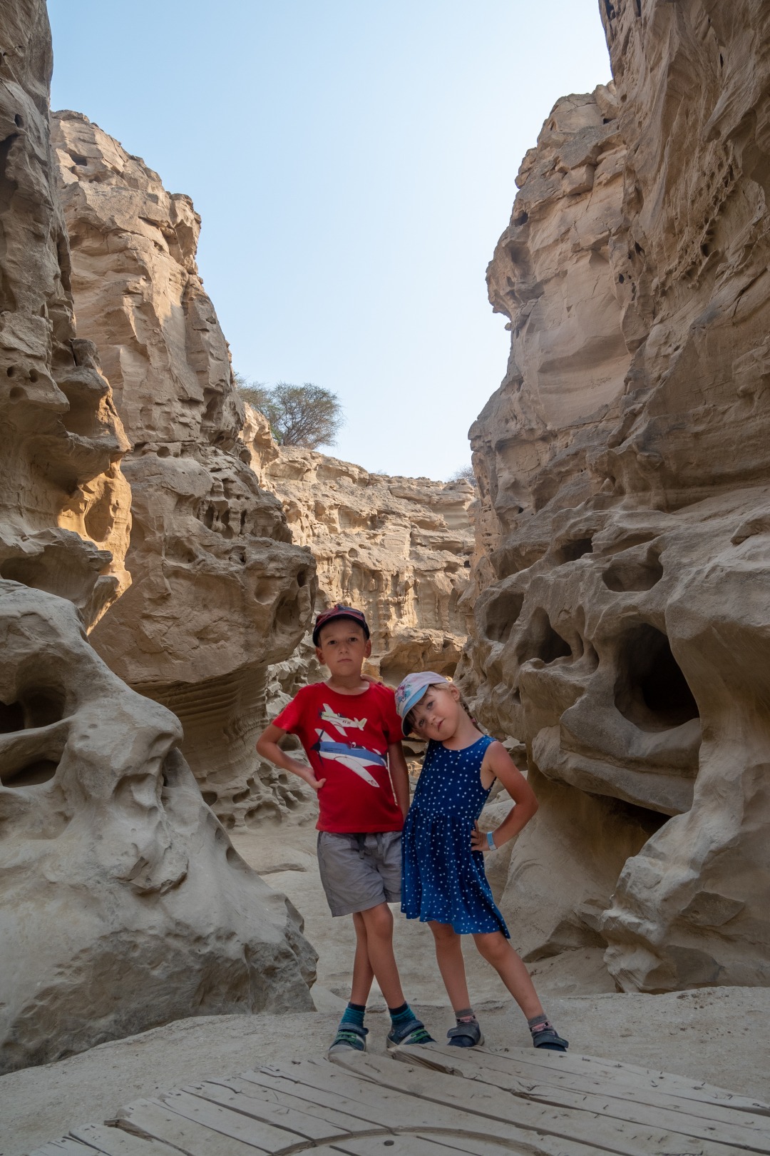 И смотреть, чтобы не упасть в колодец или расщелину. Напоминает одновременно и Чарынский каньон в Казахстане, и виды с рекламных плакатов про Иорданию. Но жара здесь просто чудовищная. Мы перед выходом из машины облились с ног до головы водой — футболки, кепки, джинсы… На ветру и на солнце высохло все моментально.